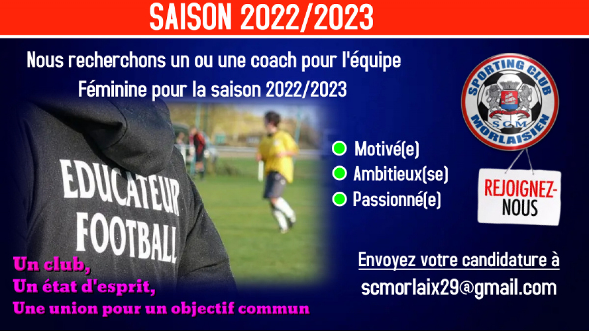 Le SC Morlaix est à la recherche d'un ou d'une coach pour diriger son équipe féminine minime. Si vous souhaitez diriger cette formation, contacter le club par mail à scmorlaix29@gmail.com