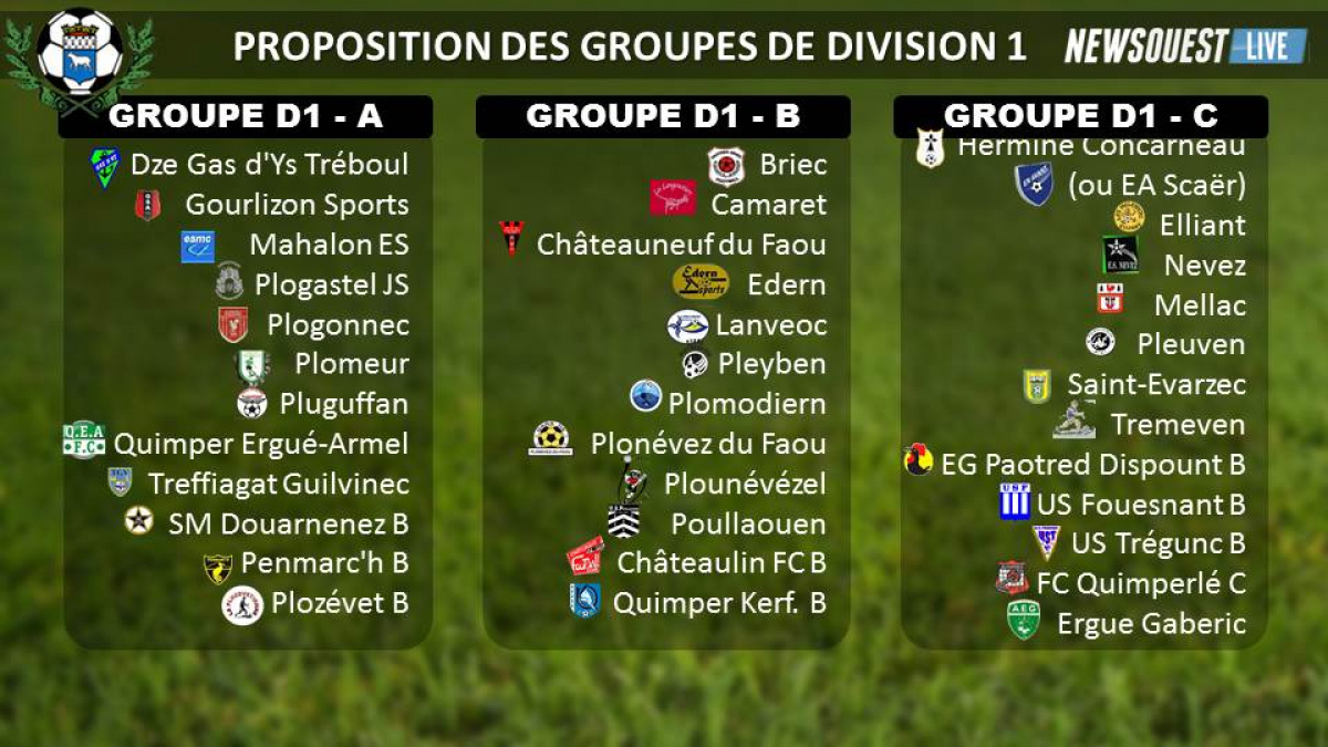 Le projet des groupes D1 a été dévoilé pour la saison 2015/2016, lors de l'assemblée générale du district du Sud-Finistère. Il sera arrêté le 15 juin. Pour toute requête de changement, prendre contact avec le distrcit 29 Sud. 36 équipes sont concernés par ce projet qui déterminera leur saison prochaine. A peine démarré, le groupe D1C avec Hermine Concarneau (ou Scaër), l'Amicale Ergué-Gabéric, Mellac, Elliant, Trégunc B, Paotred Dispount B apparaît déjà comme le groupe de la mort.