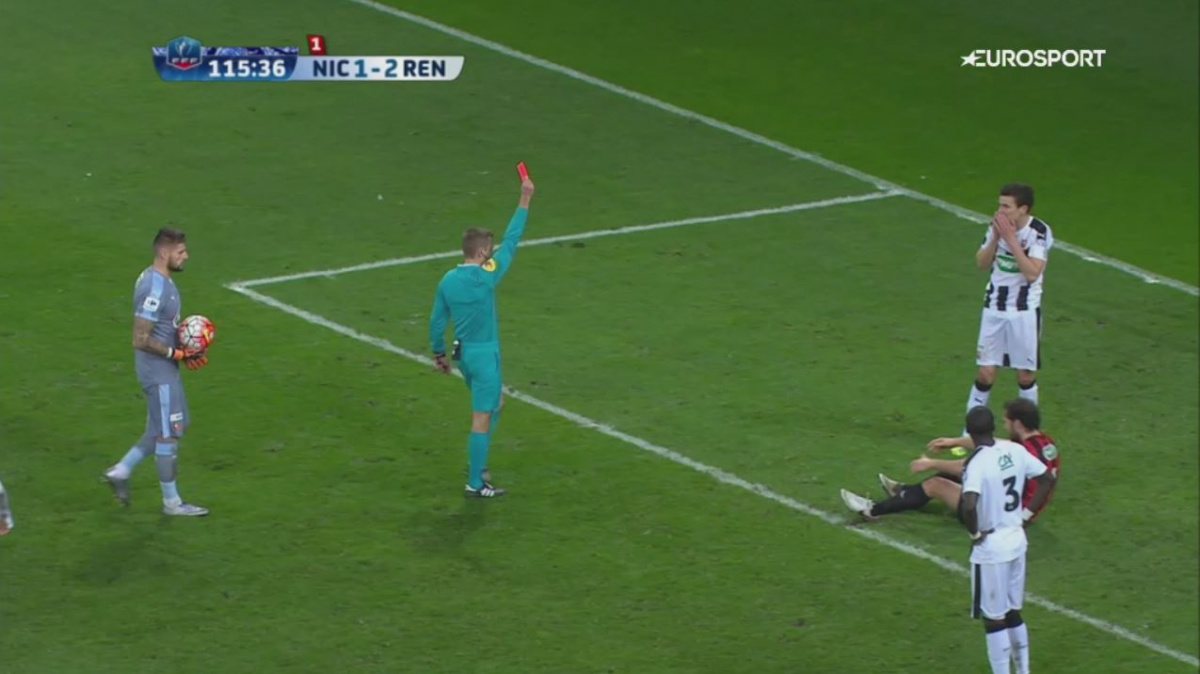 Avec l'ouverture du score d'Alexandre Mendy (38') en première mi-temps, les Nicois, bien que réduits à dix après l'expulsion de Vincent Koziello, ont résisté jusqu'à dix minutes du terme et l'égalisation Rennaise de Jérémie Boga (81'). Les deux équipes arrivaient à la fin du temps règlementaire sur le score d'égalité (1-1). En prolongation, Benjamin André se retrouvait à 20 mètres et déclenchait une frappe limpide qui terminait dans la lucarne Nicoise (2-1 - 112'). Nice réussisait à revenir au score dans les dernières minutes après un penalty généreux sifflé par M.Turpin et transformé par Hatem Ben Arfa.