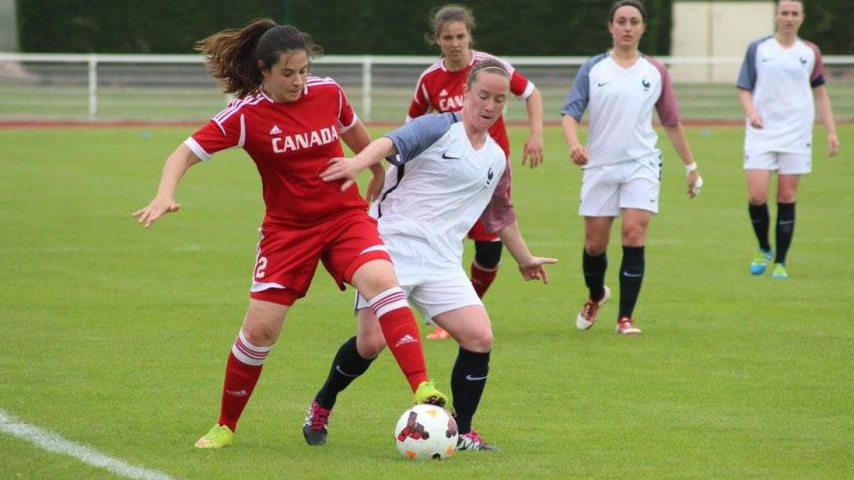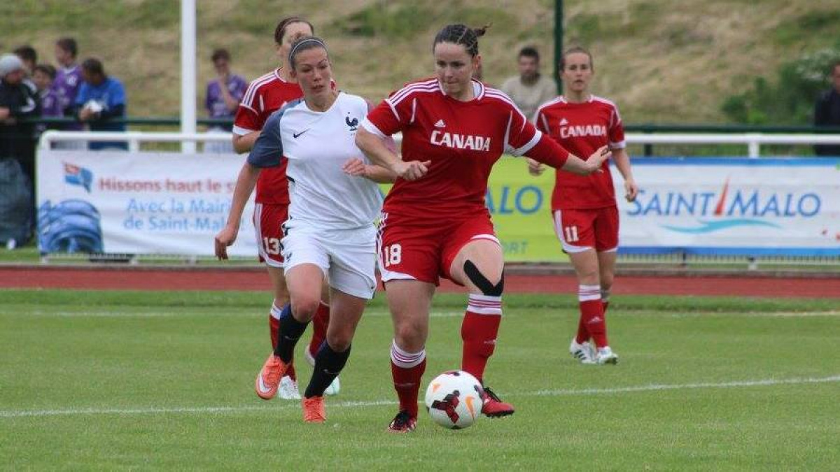 Comme à son habitude, les tricolores rentraient rapidement dans la rencontre et ouvraient le score à la 12° nminute par Gathrat sur une passe de la Malouine Justine Gourvil. Cugat avec une tentative de loin, inquiétait les Canadiennes mais le ballon était bien capté par la gardienne. A la 27' minute encore une grosse occasion pour les Françaises avec une reprise de demi-volée de Bernard qui passait tout près du poteau droit de Clarke, la gardienne du Canada. A la demi_heure de jeu, les tricolores doublaient la marque à la 31' par Machart d'une reprise du droit sur un centre de Gueheo (2-0 pour la France). Huit minutes plus tard, sur corner, les Canadiennes encaissaient un troisième but contre son camp de Litjens Cusan (3-0 pour la France). Les deux équipes regagnaient les vestaires avec un avantge de trois buts pour les bleues