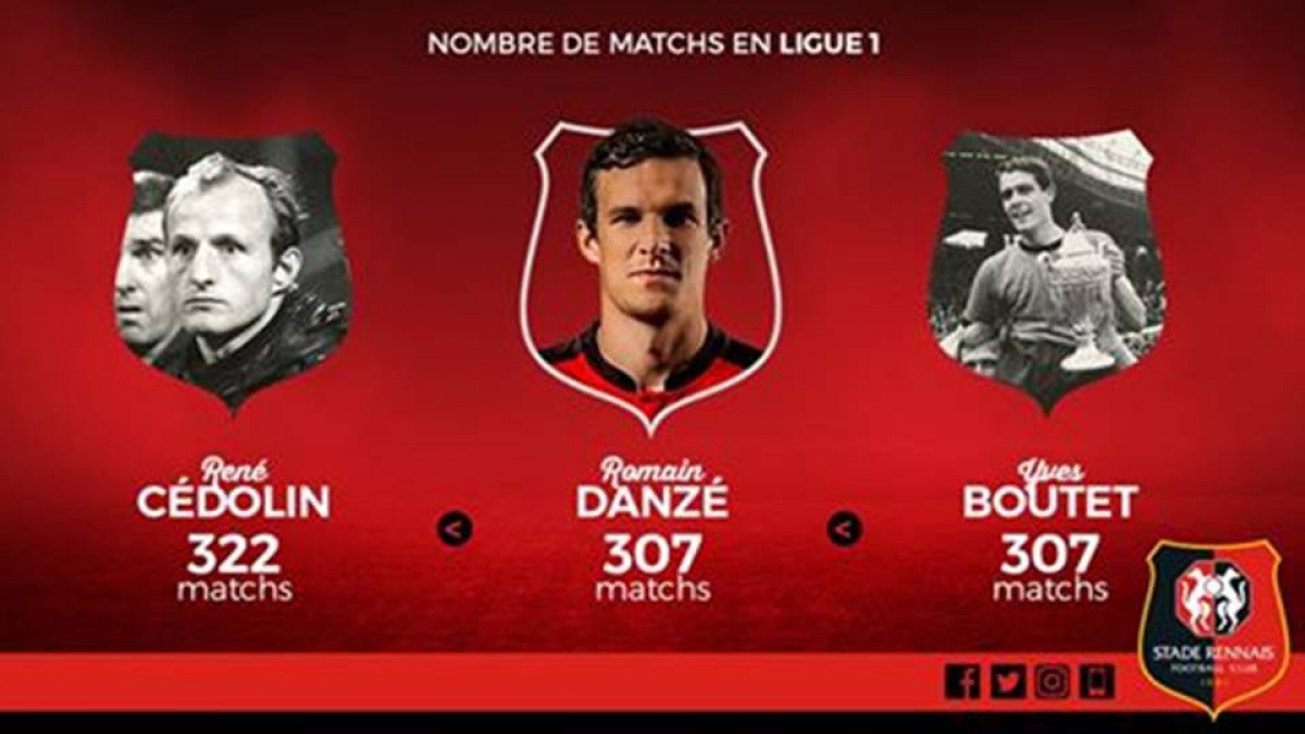 En étant aligné ce week-end du 12 avril 2017 à Nancy, Romain Danzé, natif de Pouldergat, entrait un peu plus dans l'histoire du Stade Rennais en égalant le record de Yves Boutet. Il arrive maintenant en seconde position juste derrière René Cedolin qui detient le record du plus grand nombre de matchs joués sous les couleurs du Stade Rennais. A dix jours près, les deux joueurs étaient nés le même jour, le 3 juillet pour Romain Danzé et le 13 juillet pour René Cedolin. Comme un autre joueur du Sud-Finistère, Jean-Pierre Bosser, natif de Pouldreuzic avec le Stade Brestois en D1, Romain Danzé est parti pour dépasser le record absolu de René Cédolin.