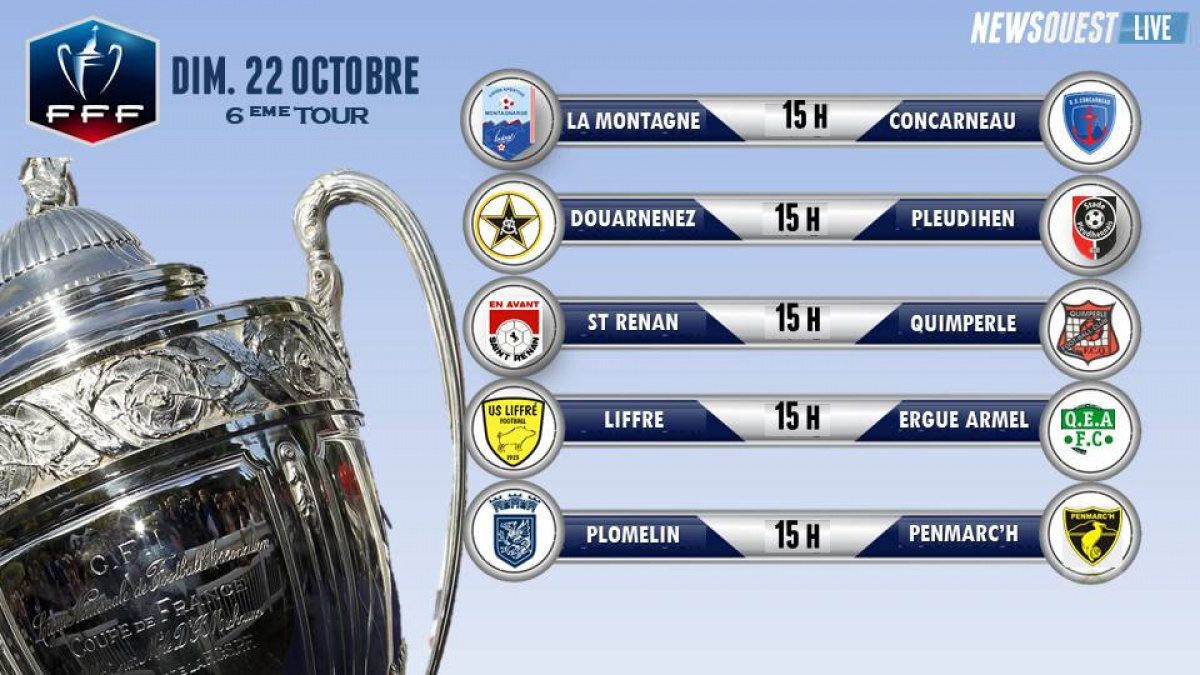 Ce jeudi soir, au siège du journal régional, Ouest-France, le tirage du 6ème tour de la coupe de France a été effectué par le quintuple vainqueur du tour de la coupe de France, Bernard Hinault. 9 clubs finistériens sur les 28 bretons en lice, furent concernés. Le dernier représentant, le Stade Brestois n'entrera en jeu qu'au tour suivant. La barre a été place haute avec des chocs captivants comme l'AS Plomelin (R3) - CS Penmarc'h (R2), qui garantit au 29 Sud une place au 7ème tour. La Stella Maris Douarnenez (R2) garde sa chance au tirage avec la réception de Pleudihen (R3). En revanche, le Quimper Ergué-Armel FC (R3), tiré en premier, doit aller à Liffré (R2). L'US Concarneau continue son parcours face à des équipes de coupes avec le déplacement à Mané Braz à l'US Montagnarde (N3). C'est jouable pour Bodilis Plougar, comme pour son adversaire du 7ème tour, Plédran. Un choc de R2. L'US Cléder devra à nouveau forcer son destin à Séné (R2). Le FC Landerneau (R1) monte de plusieurs marches en endossant la peau du petit face à Vitré (N2). Enfin, un duel entre Finistériens entre l'EA Saint-Renan (R1) et le FC Quimperlé (R2), au stade Abbé Le Gall.  Les matchs se joueront le week-end du 21 et 22 octobre.
