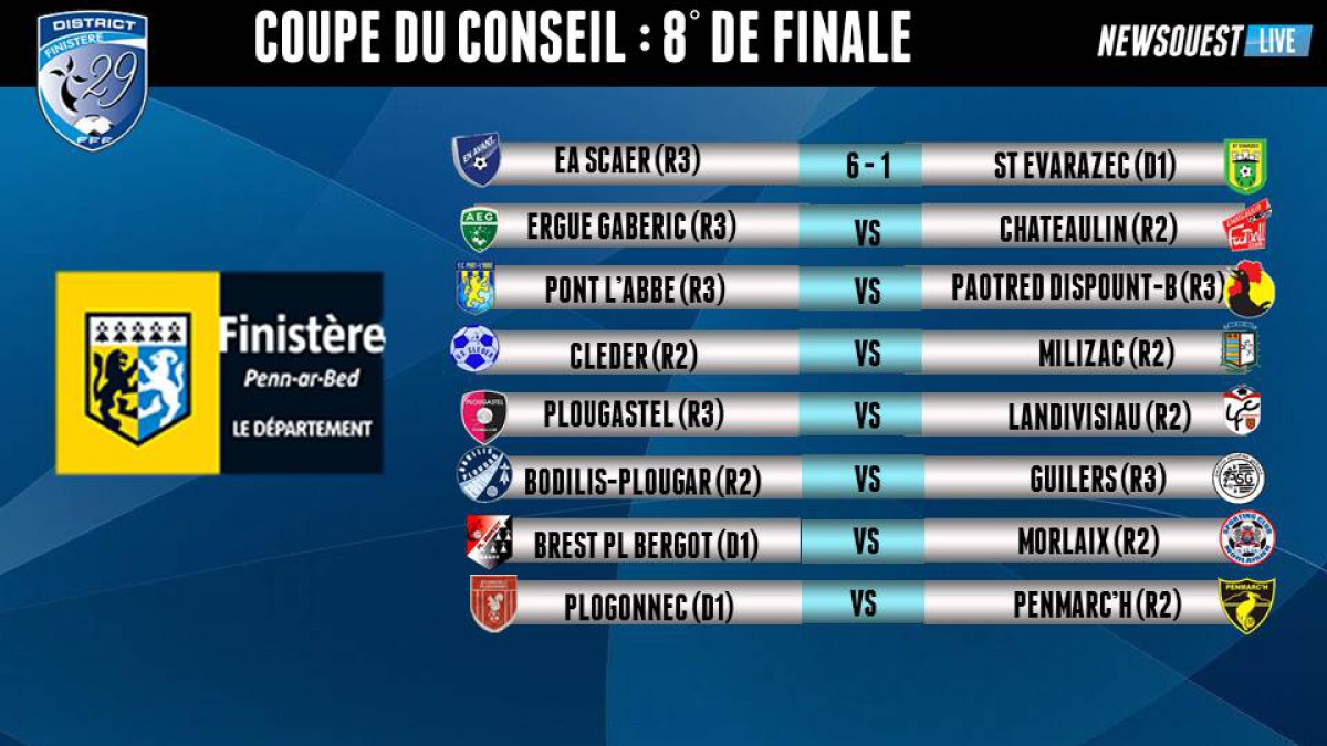 Le tirage au sort des 1/8 ème de finale de la Coupe du conseil vient d'officialiser les huit rencontres qui se joueront le jeudi 10 mai. Deux rencontres ont déjà eu lieu dimanche dernier 6 6 mai avec la victoire de Scaër face à Saint Evarzec 6 à 1. Mardi 8 mai aura lieu la rencontre entre Plogonnec et le CS Penmarc'h. Le tirage des ¼ et ½ finales auront lieu le mardi 15 mai au siège du district à Brest à 18h30, et en visio conférence du district à Quimper. Les clubs qualifiés y sont invités.