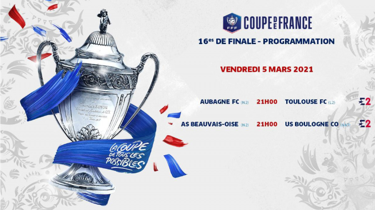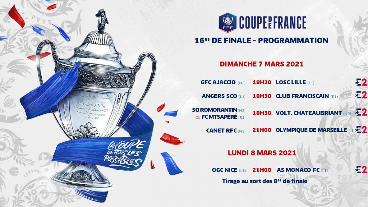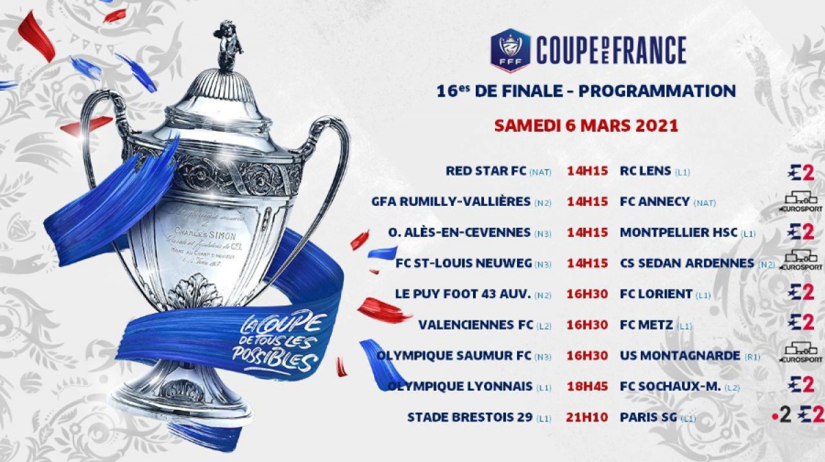 La FFF a officialisé la programmation des 16es de finale de la Coupe de France. Les rencontres s'étaleront du vendredi 5 mars au lundi 8 mars. Les deux clubs morbihannais du FC Lorient (L1) face au Puy (N2) et l’US Montagnarde (R1) face à Saumur (N3) joueront le samedi 6 mars à 16 h 30. Ils passeront respectivement sur Eurosport 2 et sur Eurosport. Pour le Finistère, le Stade Brestois affrontera le Paris Saint Germain le samedi 6 mars à 21h10 et sera retransmis sur France 2 et Eurosport 2.