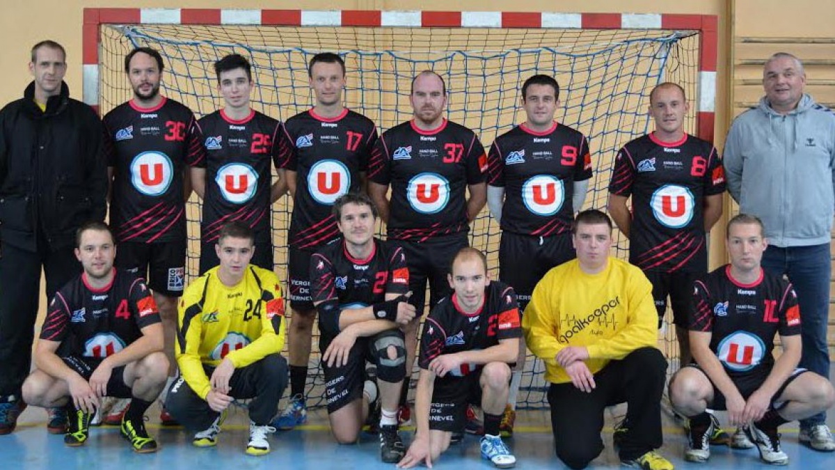 Le groupe du HBC Bigouden: Yann Holingue, Florent Jégou, Arthur Tirilly, Romain Depienne, Nicolas Le Berre, Théo Davidoff, Scott Tirily, Tristan Fauché, Pierre-Louis Berrou, Boris Daniel, Brendan Hemery, Hippolyte Fauché, Tom Kerriou, Yann Guerou. Coach: Fabrice Cuault