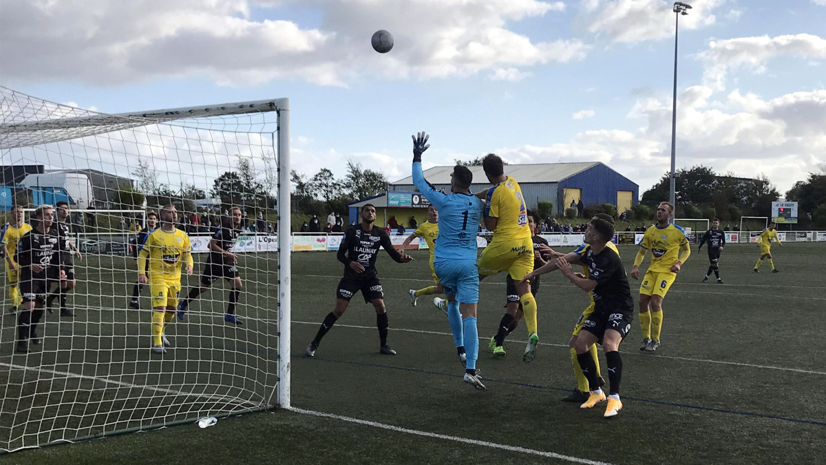 Yves-Marie Kerjean dispute le ballon à la tête avec le portier de la TA Rennes. Crédit photo: Kévin Darchen