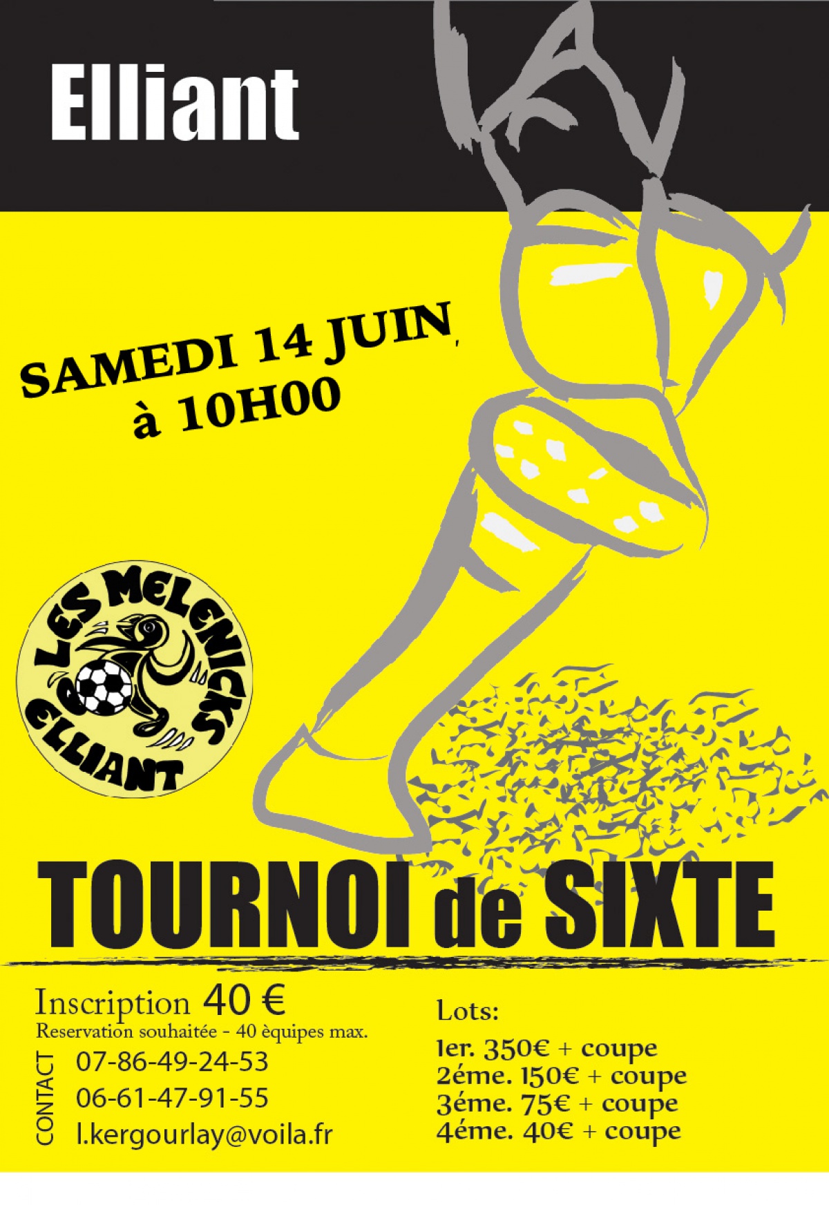 Le tournoi de sixte de Elliant se jouera ce samedi 14 juin. Le format est simple: 6 joueurs + 2 remplaçants sur demis terrains (4) - principale et consolante après les poules. inscription 40 euros. Réservation souhaitée - 40 équipes max - dotation 615 euros. Contact: Ludovic au 0786492453 ou Laurent au 0661479155 - lesmelenicks.fr