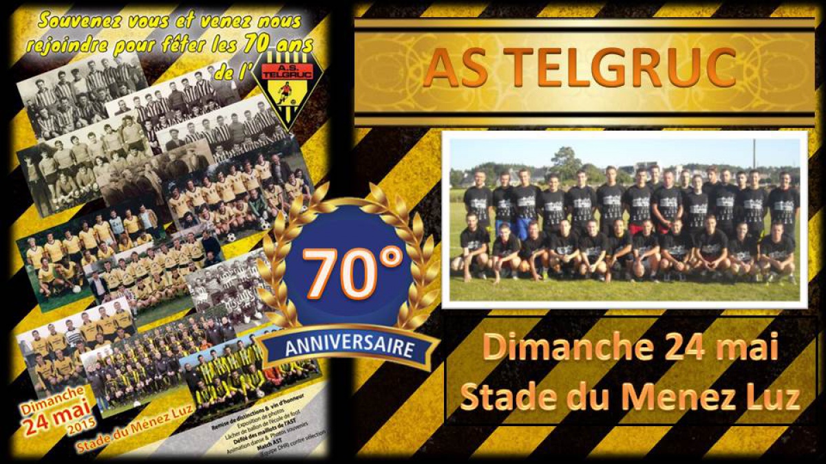 Le dimanche 24 mai, l' AS Telgruc fêtera ses 70 ans d'existence. Un âge respectable pour cette Amicale Sportive qui a marqué de son empreinte la vie locale, à Menez-Luz. Un anniversaire qui sera l'occasion de se remémorer la riche histoire du club, passée et plus récente, à travers rencontres entre les témoins de la vie de l'AST, dirigeants, joueurs et supporters grâce aux expositions de photos, de diaporamas et la soirée repas