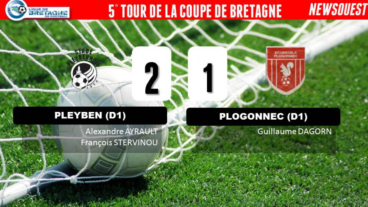 A domicile, pour ce match avancé du 5ème tour de la coupe de Bretagne, Pleyben (D1) s'est qualifié pour le prochain tour en battant Plogonnec (D1), tombeur de plusieurs équipes de ligue aux tours précédents avec le Quimper Penhars FC et Plomelin. Le score était acquis dès la mi-temps avec cet avantage de 2-1. Il le restera jusqu'au terme de ce match qui voit la qualification des Pleybinois pour le 6ème tour. Guillaume Dagorn est l'unique buteur pour les visiteurs, dans cette rencontre. Pour Pleyben, les buteurs se nomment Alexandre Ayrault et François Stervinou.