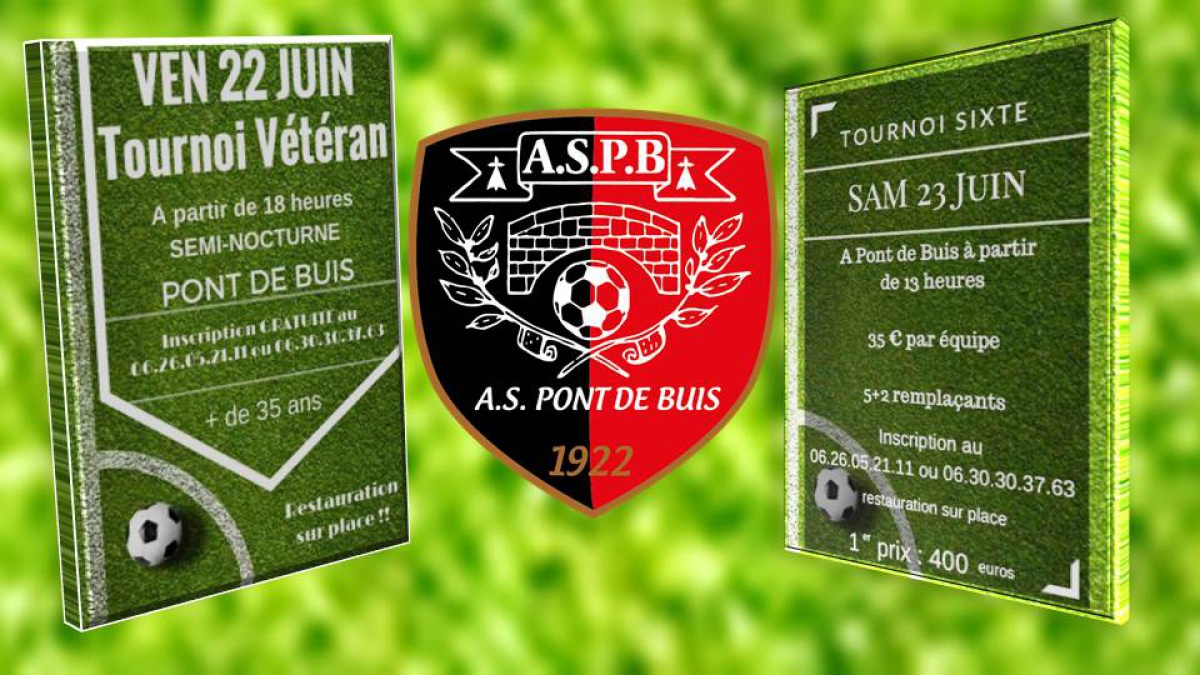 Comme l'année dernière, l'AS Pont de Buis organise ses deux tournois annuels de vétérans et de sixte le vendredi 22 et le samedi 23 juin. Le tournoi Vétérans (+ 35 ans) se déroulera en semi-nocturne et débutera à 18 heures. Le tournoi de sixte se jouera le lendemain à partir de 13 heures (5 + 2 remplacants). Le premier prix est de 400 euros. Restauration sur place