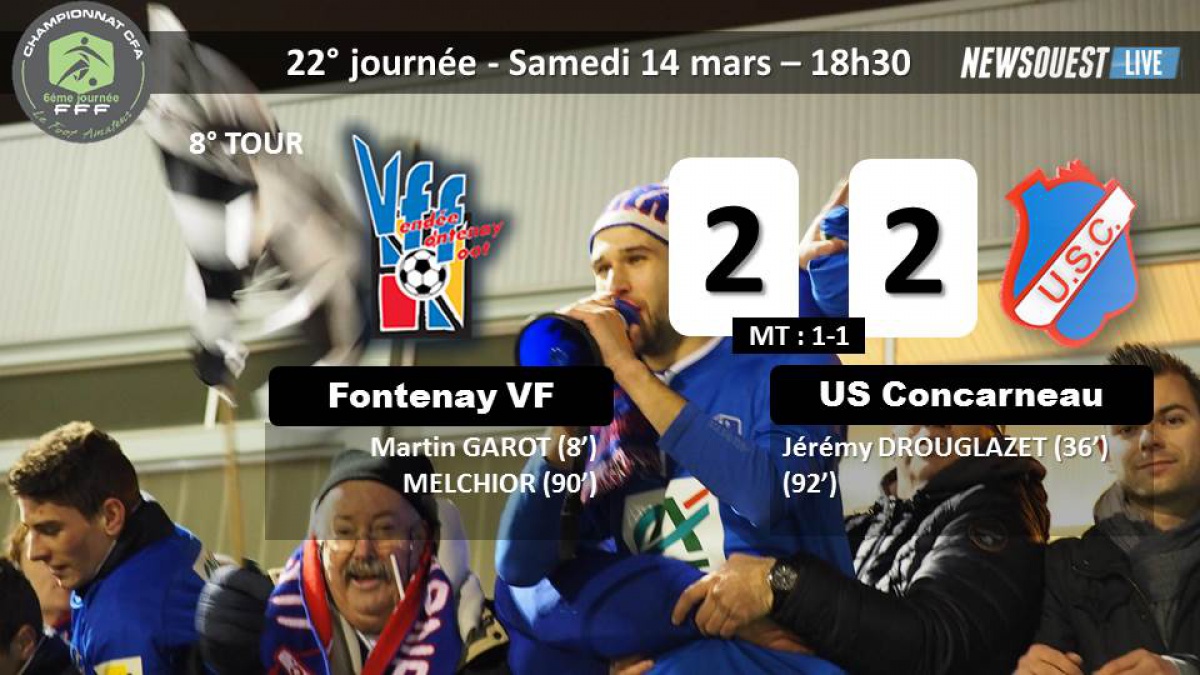 Face à la lanterne rouge, Fontenay Le Conte, l'US Concarneau affichait son envie de raffler les quatre points en jeu pour se projeter tout en haut du classement. Surpris à froid par l'entame des Vendéens avec un but dès la 8ème de Martin Garot, les Thoniers sont sortis de leur torpeur juste avant le repos par une nouvelle réalisation de Jérémy Drouglazet (36'). Remis à quai, l'US Concarneau et Fontenay Le Conte se sont neutralisés toute la seconde période, avant une fin de match complètement folle. Fontanay croyait avoir fait le plus dur en marquant à la 90', mais Concarneau possède un mental de champions, cette année, avec une égalisation in-extremis sur un coup-franc. L'affaire est bonne au plan comptable avec la défaite du Stade Bordelais à Plabennec (2-0) et celle de Trélissac à domicile face aux Herbiers (2-4).