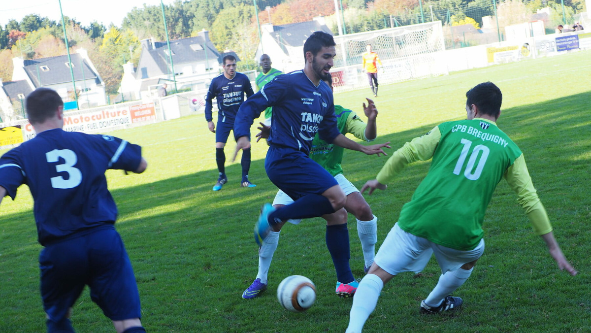 Ce dimanche 1er novembre 2015 restera comme un des grands moments dans l'histoire de l'US Trégunc, avec la première victoire acquise en DH contre le CPB Bréquigny. Au terme d'un match indécis, Trégunc s'est accroché à son avantage de début de match, but de Clément Collorec (8') sur une passe décisive de Clément Toupin, à la limite du hors-jeu pour l'arbitre assistant. Même si une maîtrise de la balle apparaissait supérieure aux Rennais, les Sudistes avaient disposé un bloc solide, prêt à couper toutes les trajectoires et suffisamment compact pour entrevoir que des bribes à leurs adversaires. En première mi-temps, seul Benjamin Mesgouez, côté visiteur, trouva un espace ouvert pour armer une frappe au ras du poteau de Corentin Le Borgne (23'). Trégunc jouait les contres à fond. Le remplaçant Kévin Veillon, sur un une-deux avec Clément Collorec, envola trop sa frappe malgré une bonne position à l'entrée de la surface (27').