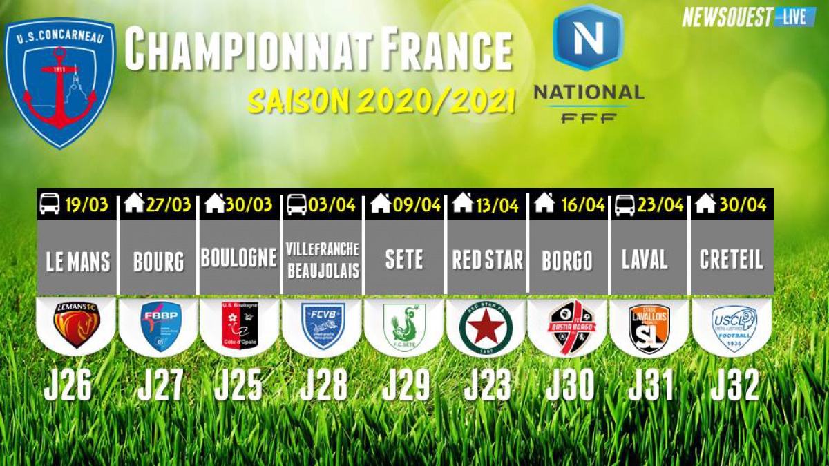 Avec les différents reports de matchs, les Concarnois découvrent le nouveau calendrier qui se présentent à leurs yeux jusqu'à la fin du mois d'avril. Du 19 mars à fin avril, ce n'est pas moins que neuf matchs que vont disputer les thoniers. Six matchs à domicile au Stade Guy Piriou (Bourg en Bresse, Boulogne, Sète, Red Star, Bastia Borgo, Créteil) et trois déplacements (Le Mans, Villefarnche en Beaujolais et Laval). Les Finistériens viennent de prendre connaissance de la nouvelle date du match contre l’US Boulogne/Mer, qui devait se jouer samedi dernier. La rencontre est reportée au mardi 30 mars entre les rencontres face à Bourg en Bresse et Villefranche en Beaujolais. Durant cette période dantesque, les joueurs de Stéphane Le Mignan bénéficieront de déplacements plus réduits avec six rencontres disputées à Guy Piriou. La fatigue liée aux déplacements sera fortement réduite.