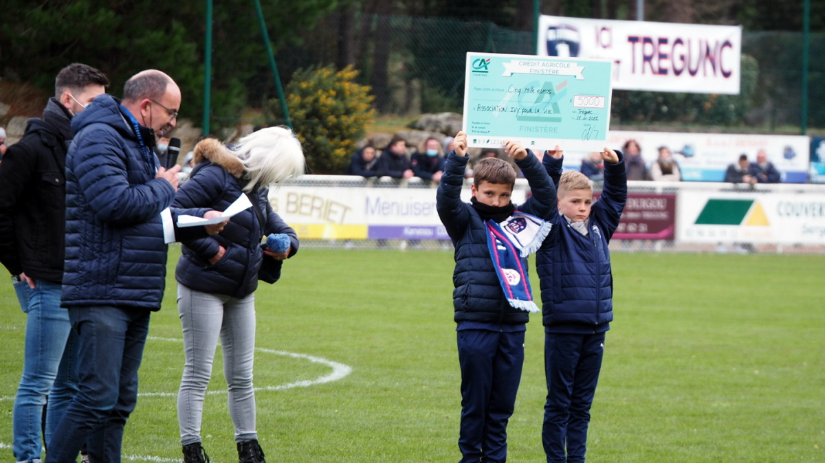 Réuni dans le rond central, dix minutes avant l'entrée des joueurs pour le 8ème tour de la coupe de France, le président Jacques Naour a profité de cet évènement historique du 8ème tour de la coupe de France, pour l'US Trégunc, afin de rendre encore plus belle et touchante cette fête du football, avec un chèque de 5.000 €, remis par l'US Trégunc, pour l'association Ivy pour la vie. Même sans la présence de la petite Ivy, 3 ans, excusée le plus naturellement du monde par son papa, Tony André, l'association lève des fonds pour venir en aide et soutenir la recherche pour contrer les maladies neuro-musculaires non identifiable. Cet élan de solidarité a été unanime et largement applaudie par le milier de specateurs présent au stade, ce dimanche. Jusqu'à ce que le président, Jacques Naour, ne pique le premier sprint de la partie, pour reprendre le micro à Pascal Hémon, le speaker du stade, pour annoncer une autre bonne nouvelle, l'ajout de 1.000 € supplémentaire à cette cagnotte du coeur, par le président de La Roche/Yon. A l'image du club de Carquefou, au tour précédent, qui avait reversé un euro de ces entrées, au tour précédent, La Roche/Yon marquait aussi sa solidarité pour l'association portée par Tony André, ancien joueur de nombreuses années du club de l'US Trégunc, et sa compagne, Margaux Lannurien. Au total, 6.000 € seront reversés directement pour cette cause collective. Un très beau geste de la part de l'US Trégunc, de Carquefou et de la Roche Vendée Football, qui met en relief cette solidarité sans faille.
