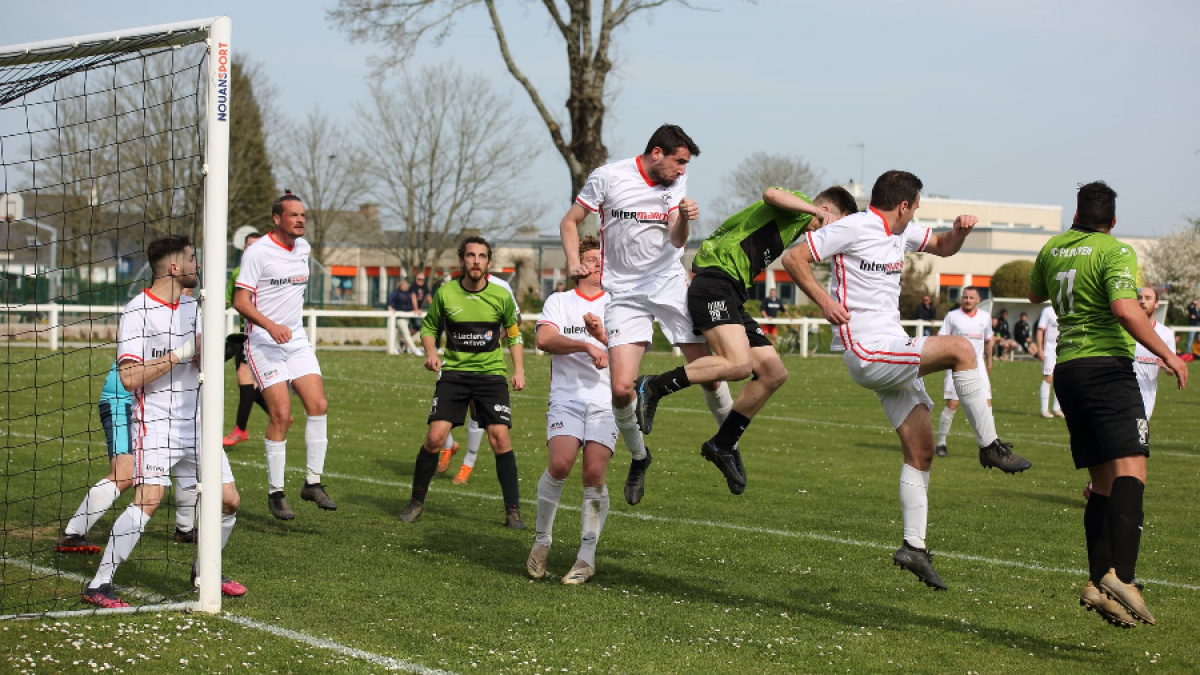 | Mathieu Chevert de dos félicite les buteurs Alexandre Moerman et Dylan Gallo. Crédit photo ES Nevez |