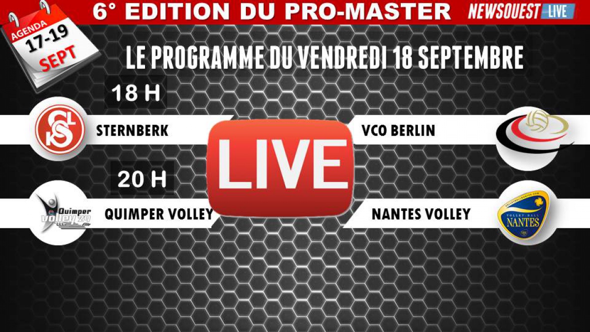 Vous pouvez suivre en Live la seconde journée de la 6° édition du Pro Master. les deux rencontres se déroulent à Concarneau à la Halle Du Porzou. Cette retransmission est possible grâce à l'équipement du club de Concarneau Volley :