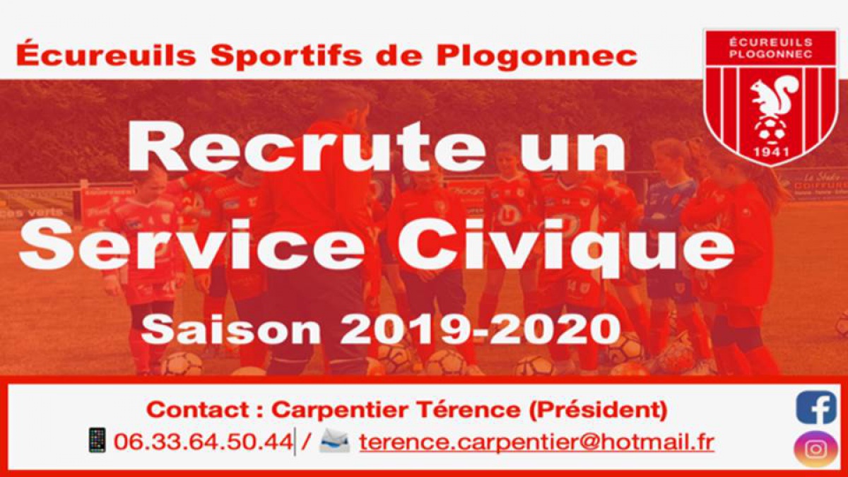 Le club des Écureuils Sportifs de Plogonnec recherche un service civique pour la saison 2019/2020. Vous êtes âgé de 16 à 25 ans et vous souhaitez vous engager dans un projet ayant pour mission principale  "La participation à l’accompagnement des jeunes (6-13 ans) dans un club de football", contactez-nous rapidement au 06.33.64.50.44 ou au 07.88.63.60.69