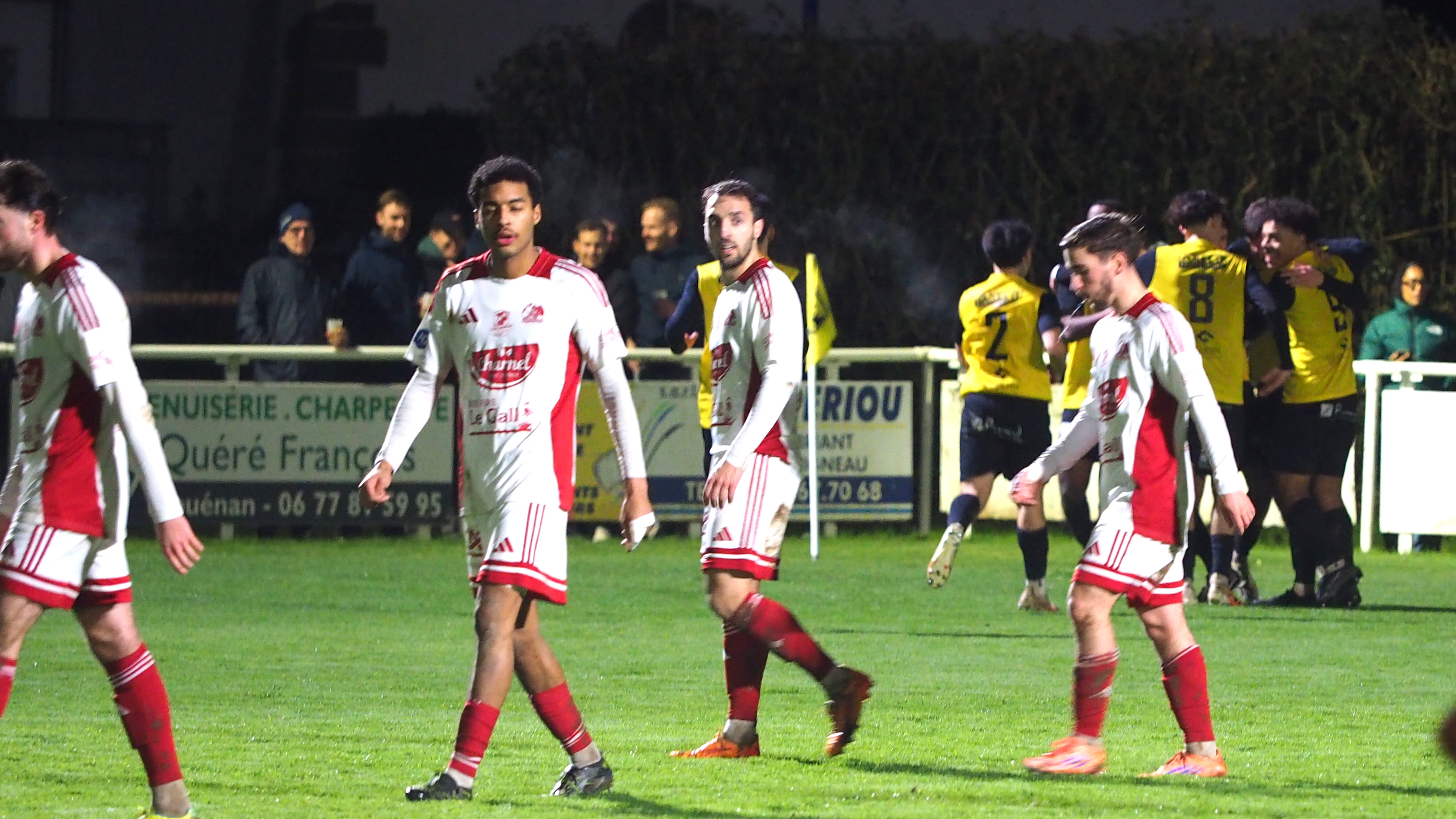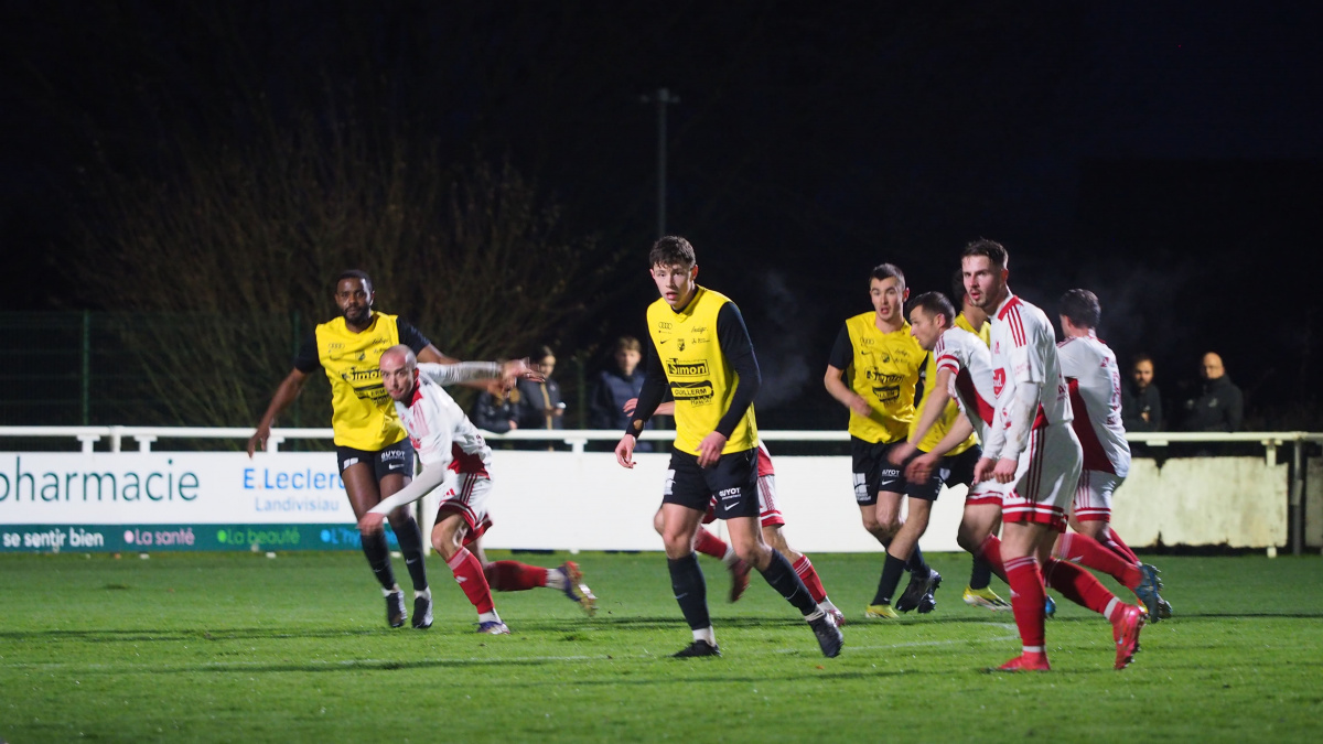 Le lever de rideau de l'année 2026 se jouait pour l'AG Plouvorn, ce samedi soir, face au Stade Plabennécois, pour un derby de R1, poule A de haut de tableau. Face à 800 spectateurs, au stade Guy de Réals, après un premier quart d'heure de retard, suite à une coupure complète de projecteurs, cette rencontrée démarrée à 19h15, au lieu de 19h, n'a pas connu de temps mort. Pied au plancher, presque impatient d'en découdre, les deux formations ont livré une sacrée bataille au cours de cette première période. Dès la 2ème minute, Antoine Bergot filait et tombait sur les gants sûrs d'Aurélien Déniel, qui bouchait parfaitement l'angle de tir, Plouvorn fit aussi l'accueil de bonne année aux visiteurs. Il fallait un gros arrêt réflexe sur sa ligne d'Anthony Laurent, pour éviter le 1-0 assurré de Driss Hellegoet, sur un service en or de Mathieu Le Han (6'). A force d'insister, la troisième fut la bonne, encore dans ce tempo décisif, Dtiss Hellegoet finissant le travail sur une différence de Mathieu Le Han (1-0, 20'). Donnant le ton général à cette rencontre qui voulait qu'à chaque fois qu'une équipe prenait l'avantage, il ne le gardait pas. Plabennec revenait immédiatement, une charge dans la surface sur Antoine Bergot, Nicolas Pellen transformait malgré l'extension d'Aurélien Déniel sur sa ligne (1-1, 24'). Appuyant fort sur les transitions offensives, Plab' avait un nouveau vent favorable, Nathan Madec avait senti le bon coup, avec un bon travail au préalable de Victor Gaulmin (1-2, 42'). La mi-temps arrivait mais Plouvorn finissait fort. A la limite de la surface, le Santécois, Sacha Abalain armait précisément une frappe parfaite pour finir au fond (2-2, 45'). Et sur l'action bouclant la première mi-temps, les Jaune et Noir étaient tout proches d'ajouter ce 3ème but.