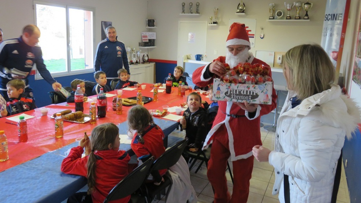Samedi dernier, après l'entrainement, les quatre-vingt assidus de l'école de foot se sont retrouvés pour le goûter de Noël, au club house du stade. Ils ont pu apprécier les bonnes crêpes Plonéouristes, le bon chocolat chaud à base de lait de Kervannes , les friandises et les chocolats. Les tous petits U6/U7 ont même eu le droit à la visite du Père Noël. L'ambiance était moins aux cadeaux ce dimanche après midi, à l'occasion des matches de championnat seniors. L'équipe A a su "se rendre le match facile", face à une jeune équipe B de Pont l'Abbé. Menant 1 à 0 à la mi-temps, elle a opportunément concrétisé ses temps forts en seconde mi-temps. Et ceci par trois jeunes de moins de vingt ans : Brendan Boennec, Corentin Guézennec et Yoann Saulnier. Une victoire 4 à 0 qui permet de passer sereinement les fêtes.