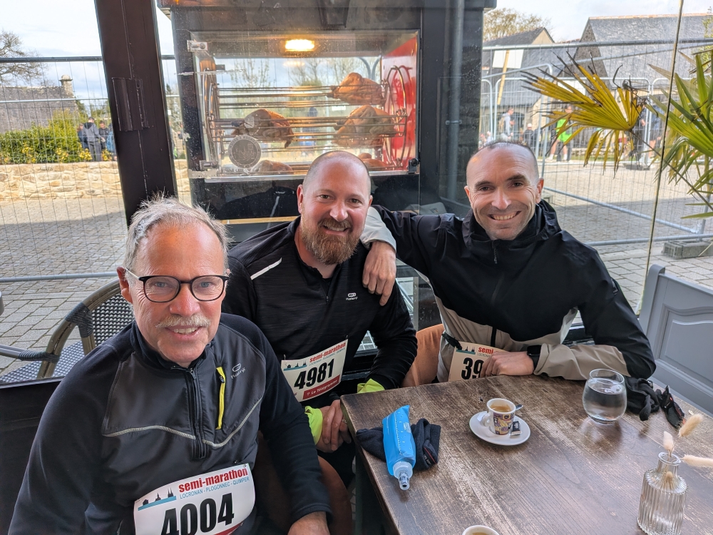 Rôtis... Comme les poulets qui tournent à la broche sur l'Etal du Prieuré. C'est dans cet état que n'espèrent pas finir Yohan, Jean-Louis et Pierre, les trois potes landernéens, eux qui ont établi leur camp de base d'avant course sur la terrasse du restaurant locronanais. D'autres ont chosi de s'installer sur le parvis de l'église romane, histoire de tuer le temps et de taper la discute, d'autres encore font les cent pas dans les pittoresques ruelles de la cité des tisserands. On échafaude des plans, on fait et on refait la course avant de l'avoir disputée. Les navettes quimpéroises débarquent des flux de coureurs sans cesse renouvelés, ça sent le stress, la transpiration et le baume du tigre. C'est long le temps qui sépare l'avant-course du départ. Presque aussi long que les 20 bornes du semi Locronan-Quimper, ce monument de la course pédestre qui en était ce dimanche à sa 9ème édition et qui a réuni plus de 3000 participant(e)s. 5000 si on y ajoute celles et ceux qui ont pris le départ du 10 kilomètres Le Croëzou - Quimper. Du jamais vu !