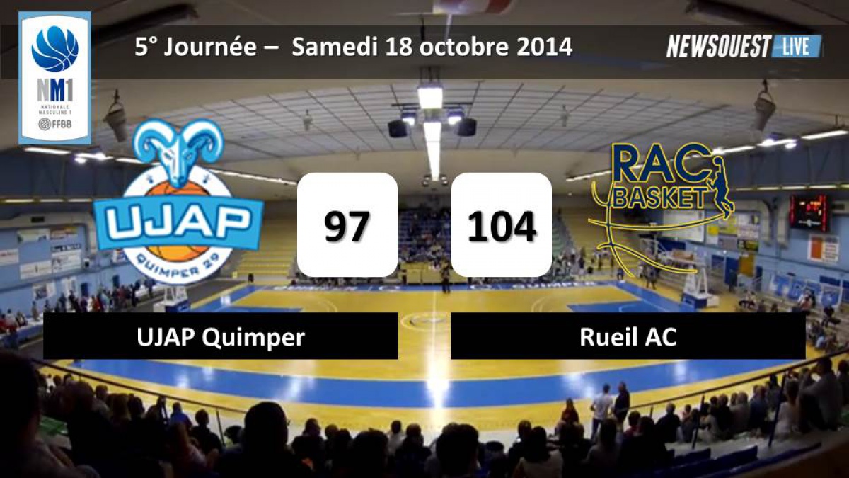 A l’occasion de la 5eme journée du championnat de NM1, le Rac Basket se déplacait à Salle omnisports Michel Gloaguen pour y affronter l'UJAP Quimper. Toujours en attente du successeur de l'américain Samuel Yeager, et diminués avec les soucis physiques de Sani et Staelens, les quimpérois s'inclinent sur le score de 97-104.