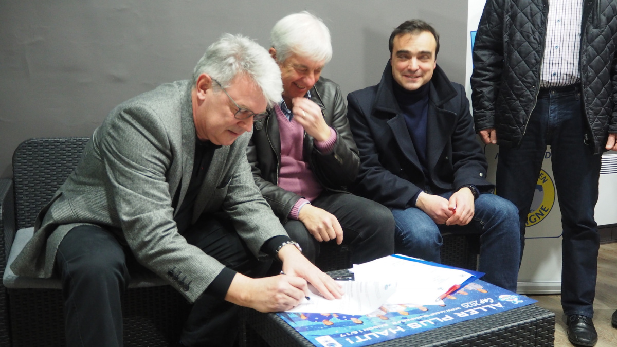 Pascal Laufray, Jean-Hugues Lombry (Crédit Agricole) et Bernard Kervarec (Ujap Quimper) signent la convention, ce samedi soir.