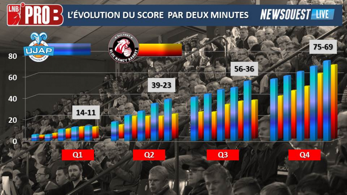 Auteur de neuf victoires en dix matchs, l'Ujap Quimper, invaincue à domicile, voulait absorber sa défaite d'Antibes (77-71) pour rebondir au mieux face à Nancy. Et quoi de mieux qu'un match de gala, face à l'autre dauphin lorrain de la poule, dans une salle à guichet fermé de 2.242 spectateurs. Dans une grande intensité, du début à la fin, avec chaque panier constesté, les deux équipes se sont livré un âpre combat. L'Ujap Quimper est restée sur cette intensité défensive en montant son habilité offensive. Détachés à la mi-temps (39-23, 20'), les locaux ont encore étonné par une récitation de leur basket, où le sens collectif prend toute son importance. Malgré un va-tout nancéen en toute fin de match, Quimper signe une victoire en lettre capitale (75-69).