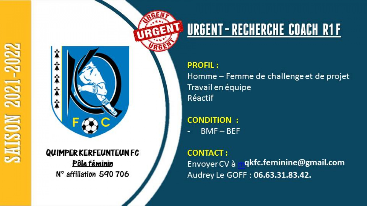 URGENT : Le Pôle féminin du Quimper Kerfeunteun recherche un coach pour son équipe fanion évoluant en R1F. Lire l'annonce de recrutement du club ci-dessous