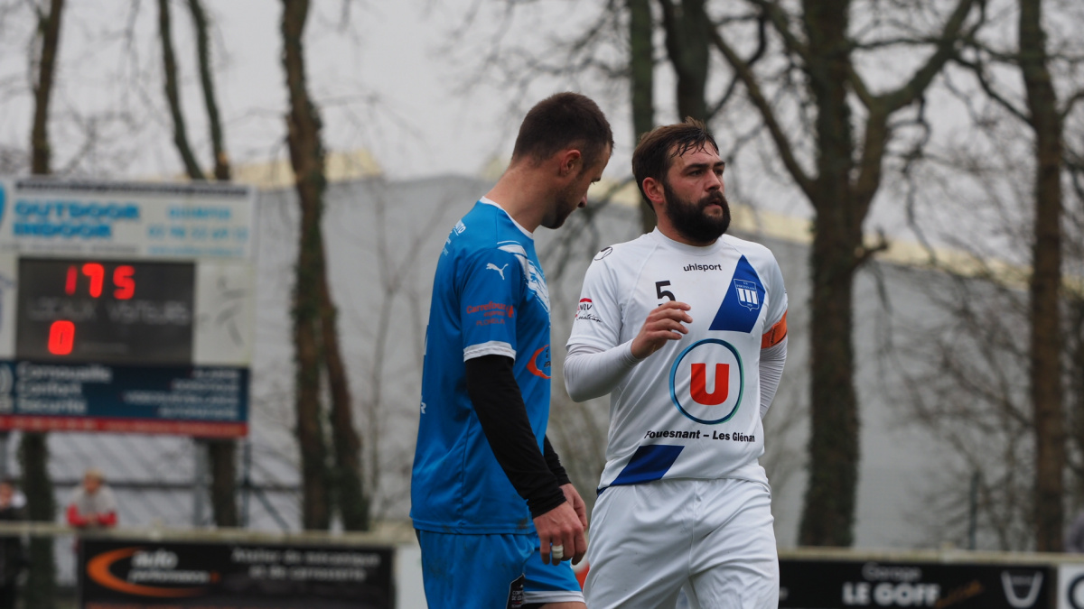Mais dans cette mission, l'US Fouesnant partait avec un sérieux handicap ... une défense en moins, avec option bricolage pour tenir sa ligne de quatre défensive. En l'absence de la paire centrale défensive, Vincent Vautour, Romain Lampre, et des latéraux, Evan Claude, Lilian Guillou, le couteau-suisse, Vincent Jourdain avait reculé d'un cran de son poste de milieu défensif, pour accoller Kévin Le Goff, pour assurer la solidité du bloc défensif visiteur. Mis à contribution dès la 8ème minute par le Plomelinois, qui le prenait à revers, servi dans la profondeur, mais bloqué par l'envergure imposante de Cyriac Grenier dans les buts adverses (8').