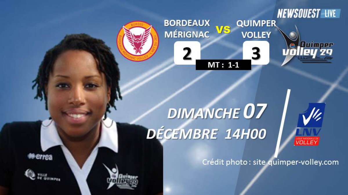 Sur cette première rencontre des matchs aller, les Quimpéroises se déplaçaient à Bordeaux pour affronter une équipe girondine, capable de rivaliser avec les meilleurs. Hier dans la soirée, l'équipe de Calais, après leur victoire contre Harnes (3-0), était passée devant Quimper. Nancy avec son succès contre Le Havre (3-0), avait confirmé sa place de leader. Les filles d'Emmanuel Fouchet ont abordé le match avec la pression du résultat accentuée par l'horaire inhabituelle du match en début d'après midi. Bordeaux Mérignac, pour le premier match de la saison avait déjà bousculé les Quimpéroises dans leur salle (3-2). La revanche a été identique au match aller. Les Bordelaises sont tout de suite entrées dans le match en empochant le premier set 25 à 19. Dans le second set, Quimper retrouve son jeu et égalise avant la mi-temps (25-18). A la reprise, même scénario, Mérignac continue avec la qualité de ses services et gagne 25 à 23. Au quatrième set, retour des Quimpéroises 25 à 20 et au dernier set, Quimper remporte le set et le match (15-8). Comme à la première rencontre de la saison, Quimper ne fait pas le plein de points. Il avait l'occasion d'écarter un concurrent aux playsoffs mais se retrouve toujours à la seconde place au classement mais à égalité avec Calais. Le samedi 13 décembre, la réception du Havre terminera les rencontres de l'année avant la reprise à la mi-janvier.