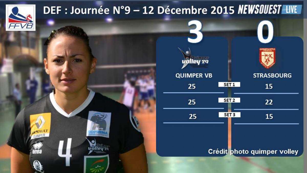 Pour son dernier match de l'année, les Quimpéroises recevaient l'équipe de Strasbourg, avant dernière du championnat. Invaincu cette saison, Quimper était favori dans cette rencontre avec des statistiques largement en faveur des filles d'Emannuel Fouchet (24 sets gagnés - 4 sets perdus contre 5 sets gagnés - 22 sets perdus pour les Alsaciennes). Dans ce premier match de la poule retour, les Finistèriennes devaient se passer une nouvelle fois des deux libéros (Iona Pristavu et Harmony Peyre). Pour les remplacer, Emmanuel Fouchet appellait Thaïs Daden, de l'équipe réserve. Autre souci, avec Talana Téré, blessée suite à un choc à l'entraînement. L'équipe de Strasbourg se déplaçait sans ses deux passeuses blessées. Dès le premier set, la différence de niveau entre les deux équipes apparaissait au bénéfice de Quimper qui l'emportait 25 à 15. Le second set était beaucoup plus accrochée et il fallait toute la puissance des Quimpéroises pour l'emporter 25 à 22. Après la pause, les Quimpéroises revenaient sur le parquet avec l'intention d'en finir sur le troisième set. Il ressemblait au premier set et se terminait sur le même score 25 à 15. Quimper finissait l'année en conservant son invincibilité.