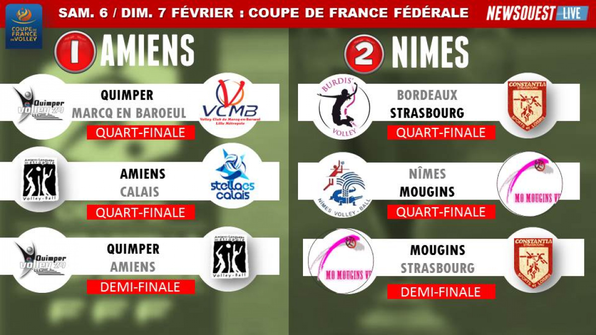 Dans l'autre demie finale c'est Olympique de Mougins qui battait SP Loisirs Constantia par 3 à 1 (23-25 / 25-18 / 25-17 / 26-24). Quimper - Mougins, c'est l'affiche de la finale de la Coupe de France Fédérale 2016 le dimanche 27 mars au Stade Pierre de Coubertin à Paris.