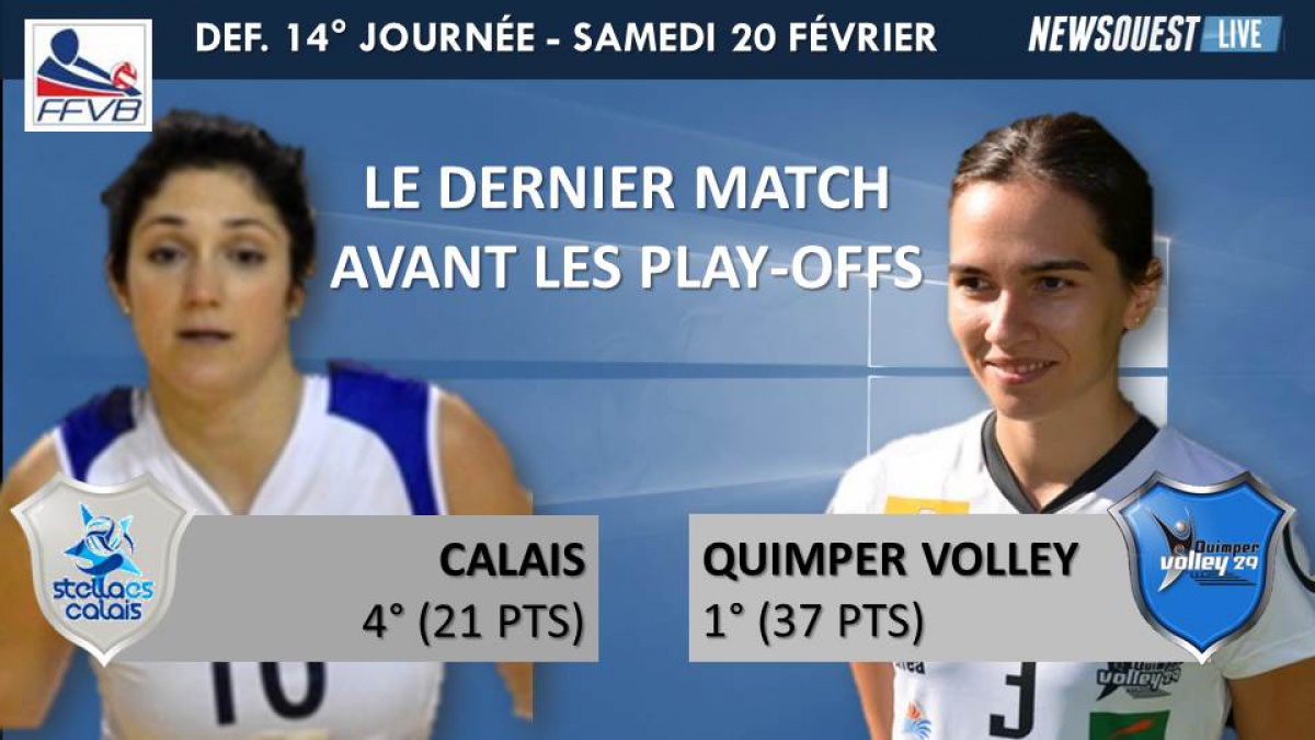 Quimper jouait à Calais son dernier match de la phase retour. Les enjeux pour les Quimpéroises étaient de rester invaincues et de comptabiliser trois points supplémentaires à leur compteur avant d'attaquer les play offs. Les Nordistes après sa victoire contre Bordeaux avaient gagné la qualification pour la phase finale. Il restait entre les deux équipes un contentieux avec les Calaisiennes qui avaient privé Quimper de la montée, au profit de Chamalières. Sans surprise, le Quimper Volley remportait son dernier match après un second set très serré (18-25 / 25-27  /  20-25)