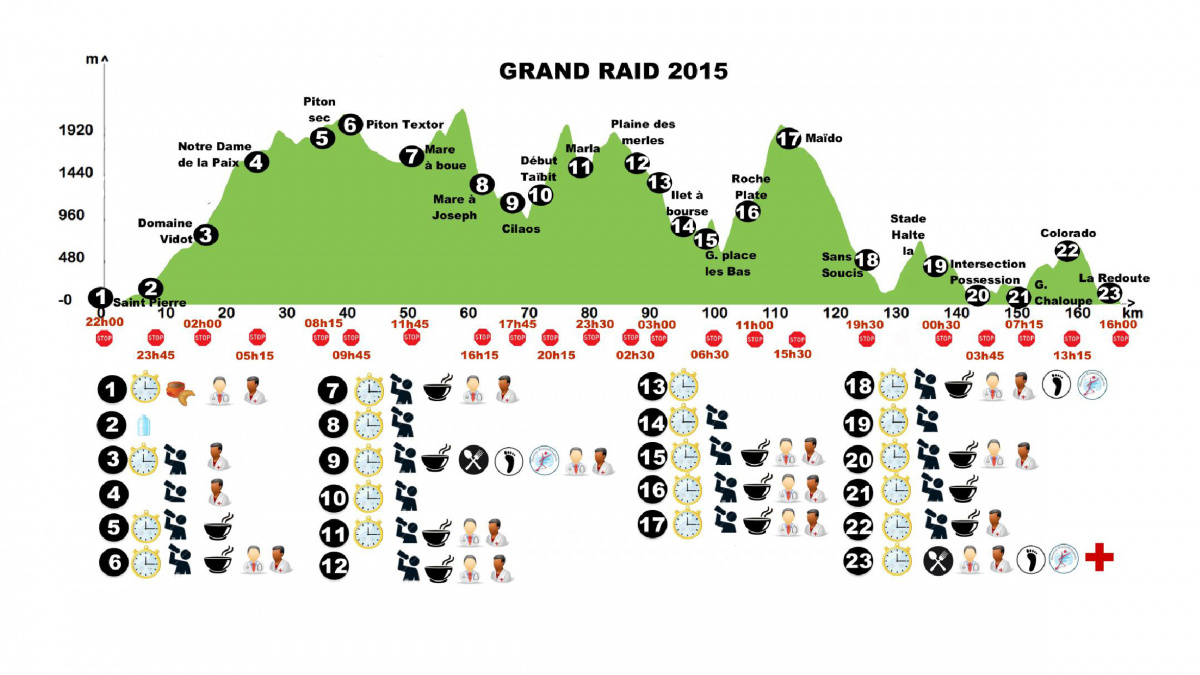 La Diagonale des fous ou le Grand Raid est le principal ultra-trail organisé sur l'île de La Réunion. C'est l'une des courses les plus difficiles au monde avec un départ donné dans le sud-est de l'île. Des milliers de concurrents entament la course par l'ascension du massif du Piton de la Fournaise. Ils poursuivent ensuite leurs efforts dans les cirques naturels de l'île, parmi lesquels Cilaos et Mafate. L'arrivée est jugée après environ 24 heures de course pour les meilleurs, au stade de La Redoute, à Saint-Denis. Par rapport à la distance et au dénivelé, cette course a le surnom de Diagonale des Fous. La carte du dénivelé des 164 kimomètres de la course résume la difficulté de l'épreuve.