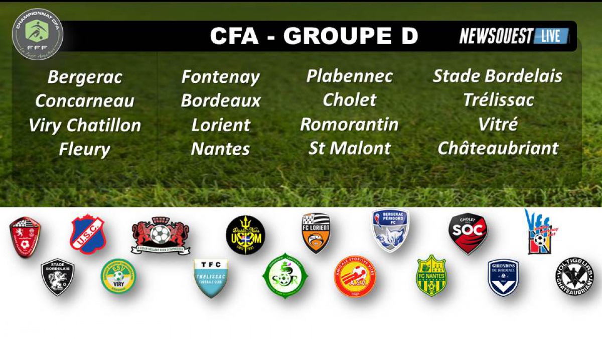 Découvrez la composition des quatre groupes de CFA pour la saison 2015/2016 que la Fédération Française de Football vient de publier. L'US Concarneau fait partie du groupe D et va retrouver les équipes qu'elle à l'habitude de cotoyer (le Stade Bordelais, Bordeaux B, Fontenay, Lorient B, Nantes B, Plabennec, Saint-Malo, Trélissac et Vitré). A ces équipes s'ajoutent 2 clubs de la région parisienne (Fleury-Mérogis et Viry-Châtillon) l'équipe de Romorantin (Loir et Cher) et les nouveaux promus de CFA2 Bergerac, Cholet et Châteaubriant.
