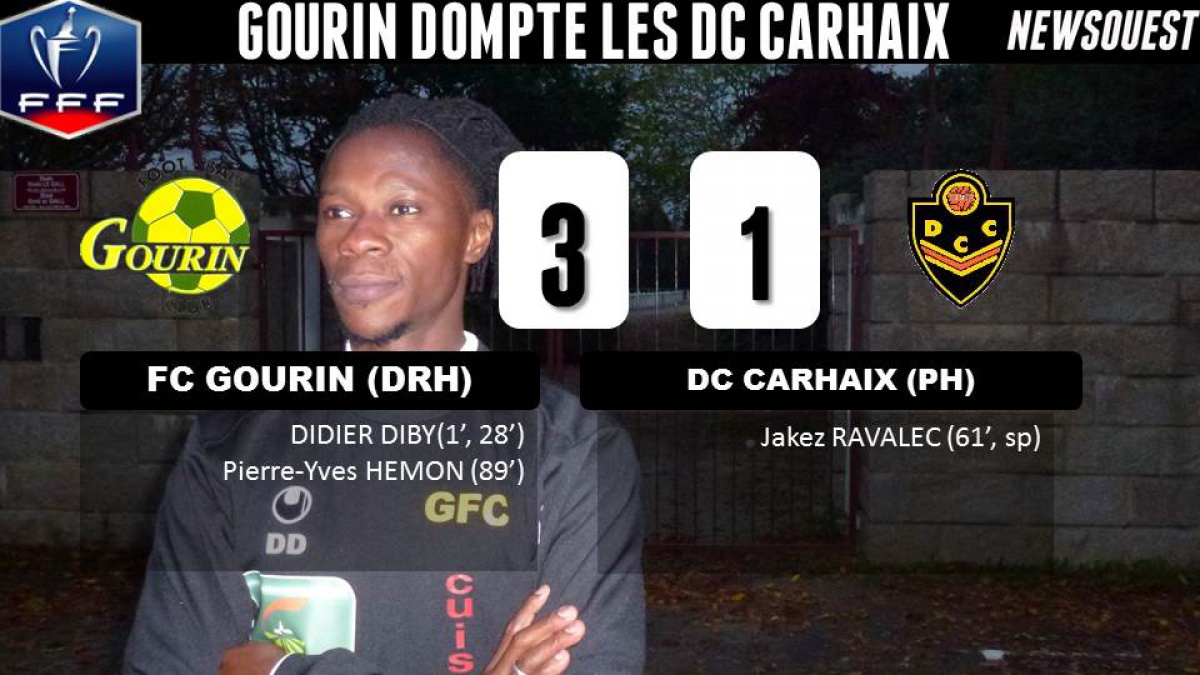 Les DC Carhaix (PH) sortait de leur coquille pour sa première apparition officielle, sous l'ère Charly Coridon. En recompositon, suite à neuf départs dans le onze type de l'an passé, les Carhaisiens étaient fortement attendus par une équipe Gourinoise, dans la continuité d'une épique fin de saison dernière. Arrachant le maintien en DRH au forceps, les Gourinois de Frédéric Vandeputte sont remplis de certitude et de force pour le défi d'une nouvelle saison. Les retardataires étaient priés d'arriver à l'heure dans les travées de Emile Le Gall. Didier Diby, l'éléphant indomptable ivoirien sonna le rappel des troupes pour surprendre l'arrière-garde Carhaisienne, dès la 1ère minute. Ce coup de départ canon de la saison ne faisait pas l'affaire des Carhaisiens, obligés à une réaction. Elle n'arrivait pas. Et ce diable de Didier Diby, toujours aussi leste à sentir les bons coups, portait Gourin à 2-0 à la mi-temps en s'offrant un doublé à la 28ème. Carhaix devait montrer autre chose sous peine d'une élimination prématurée à son entrée en compétition. Les DC affichaient un autre visage en seconde mi-temps. Ils mordaient enfin dans ce derby du Poher. Revenu d'un an d'étude sur Bordeaux, le stoppeur Jakez Ravalec convertissait le pénalty de l'espoir à l'heure de jeu. Tout était relancé! L'espoir s'équilibrait. Carhaix pouvait même revenir sans un sauvetage sur la ligne du latéral gauche, Gwen Jugant. Plus le match touchait à son terme, plus Carhaix se jetait à l'abordage. Intelligemment, Gourin laissait passer l'orage pour mieux porter l'estocade par l'impérial, Pierre-Yves Hémon dans les arrêts de jeu. La messe était dite, à Emile Le Gall. Le billet du 3ème tour était composté par le FC Gourin, qui à l'esprit et la foi pour aller loin dans cette compétition.