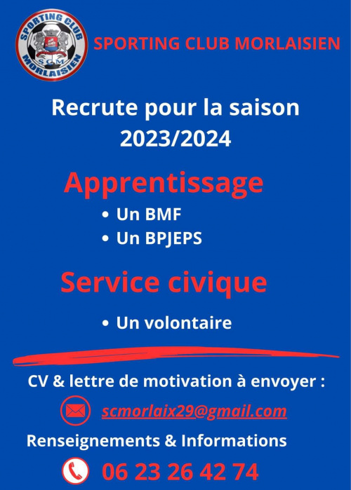 10/03/23 - 05h37Le Sporting Club Morlaisien lance une campagne de recrutement.
